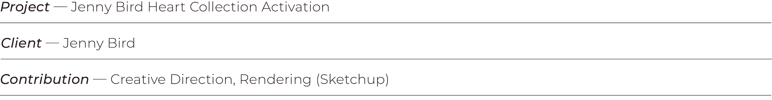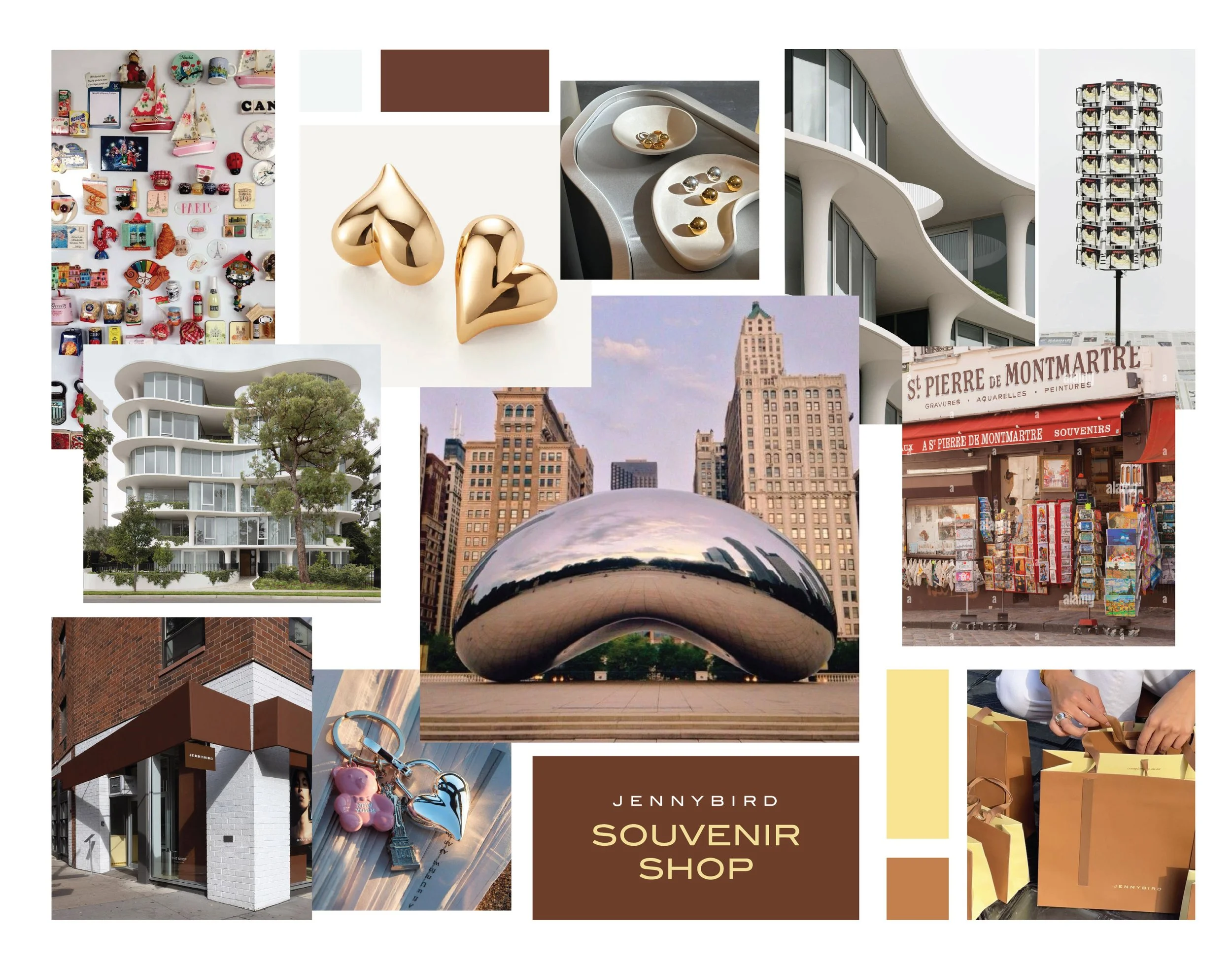 As a creative exercise, I designed a brand activation concept for Jenny Bird’s Heart Collection. Inspired by Chicago’s iconic Bean, I reimagined the idea as a heart-shaped installation—smaller in scale but perfect for an eye-catching photo moment. To shape the experience, I built a mood board drawing from the architectural forms of Jenny Bird’s NYC store and envisioned a lively souvenir shop where visitors could pick up postcards and hats. Guests would also leave with a personalized Jenny Bird heart keychain, customized at a “charm bar” with their choice of unique charms. I pictured this activation set in the bustle of New York City, during spring or fall, a moment when people are either soaking up the last outdoor days before winter or joyfully reemerging into the streets after colder months.